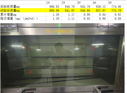 2023年浙江******產(chǎn)品檢驗(yàn)有限公司第二次采購(gòu)我司一臺(tái)型號(hào)為“WHQ-900B”型的混合氣體腐蝕試驗(yàn)箱,設(shè)備在出廠之前,工作人員已經(jīng)在我內(nèi)部的實(shí)驗(yàn)室進(jìn)行過(guò)一次合格的銅片增重測(cè)試,之后設(shè)備被運(yùn)送到客戶指定的場(chǎng)地安裝調(diào)試運(yùn)行??蛻粼谠O(shè)備運(yùn)行了一個(gè)階段后,自行進(jìn)行一次銅片增重試驗(yàn),試驗(yàn)結(jié)束之后客戶將數(shù)據(jù)發(fā)給我司,以下是客戶和我的聊天記錄和客戶第一次做的數(shù)據(jù):