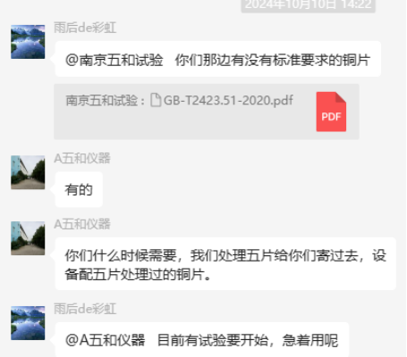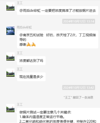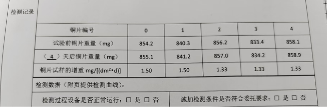 為了更好地說明銅片試驗的重要性,下面分享一個檢測公司的銅片試驗實際案例:20248月份合肥******檢測技術(shù)有限公司第次采購我司一臺型號為“WHQ-300B”型的混合氣體腐蝕試驗箱,設(shè)備被運送到客戶指定的場地安裝調(diào)試運行。安裝調(diào)試后,客戶后期自行進行一次銅片增重試驗,我司技術(shù)人員進行線上指導(dǎo)操作,試驗結(jié)束之后客戶將數(shù)據(jù)發(fā)給我司,以下是客戶和我聊天記錄以及客戶做的數(shù)據(jù)信息